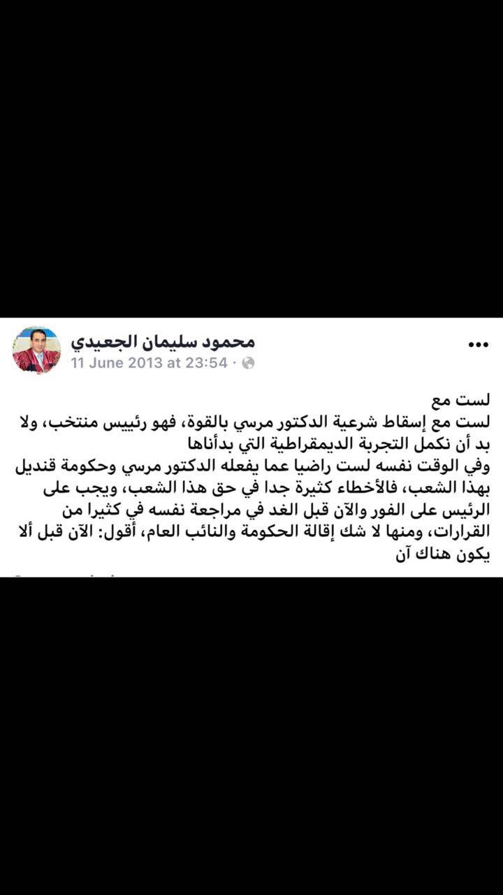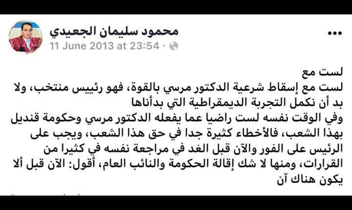 ومن بين تغريداته التي احتفظ الطلاب بصور ضوئية منها وسكرين شوت لتدوينة بتاريخ 12 يونيو 2013 يقول فيها لست مع إسقاط شرعية الدكتور مرسي بالقوة فهو رئيس منتخب :” لست مع إسقاط شرعية الدكتور مرسي ىفهو رئيس منتخب ولابد أن نكمل التجربة الديمقراطية التي بدأناها”.