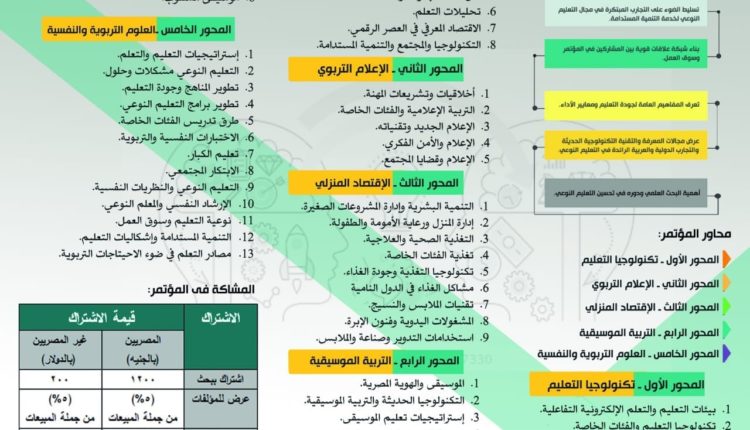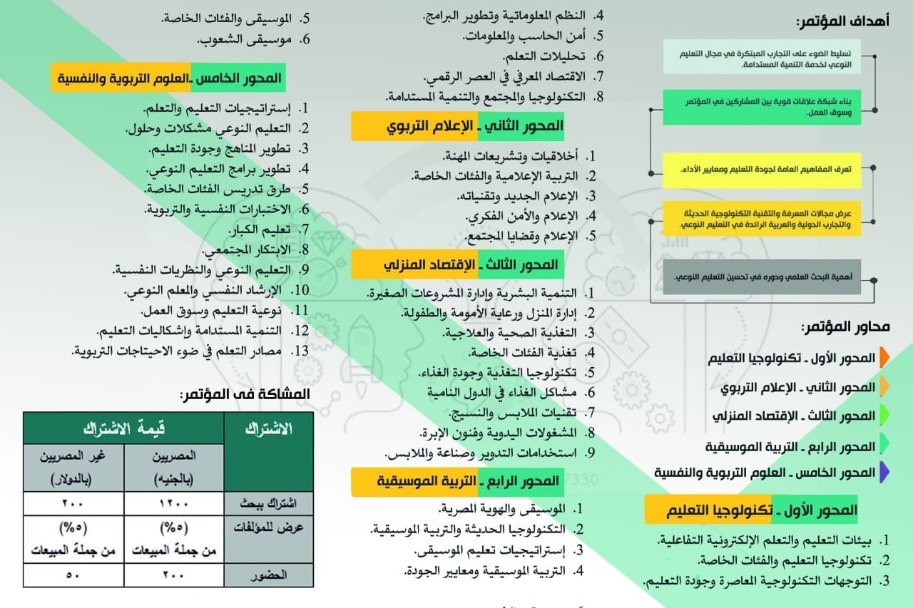 حيث يناقش محور تكنولوجيا التعليم بيئات التعليم والتعليم الإلكترونية التفاعلية وتكنولوجيا التعليم والفئات الخاصة والتوجهات المعلوماتية وتطوير البرامج وأمن الحاسب والمعلومات والاقتصاد المعرفي في العصر الرقمي والتكنولوجيا والمجتمع والتنمية المستدامة، كما يتناول محو الإعلام التربوي أخلاقيات وتشريعات المهنة والتربية الإعلامية والاعلام الجديد وتقنياته والإعلام وقضايا المجتمع، أما محور الاقتصاد المنزلي يناقش التنمية البشرية وإدارة المشروعات الصغيرة ورعاية الأمومة والطفولة وتكنولوجيا التغذية ومشاكل الغذاء في الدول النامية وتقنيات الملابس والمشغولات اليدوية وصناعة الملابس، ومحور التربية الموسيقية يتناول الموسيقي والهوية المصرية والتكنولوجيا الحديثة والتربية الموسيقية واستراتيجيات تعلم الموسيقي ومعايير الجودة وموسيقي الشعوب، وأخيراً محور العلوم التربوية والنفسية ويناقش استراتيجيات التعليم والتعلم النوعي ومشكلات وحلول تطوير المناهج وبرامج التعليم النوعي وطرق تدريس للفئات الخاصة وتعليم الكبار والابتكار المجتمعي والإرشاد النفسي والمعلم النوعي، ونوعية التعليم وسوق العمل ومصادر التعليم في ضوء الاحتياجات التربوية.
