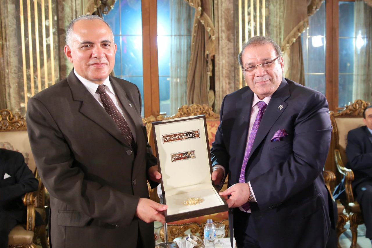 وقام د. حسن راتب باهداء قلادة جامعة سيناء الى وزير الرى والموارد المائية د. محمد عبد العاطى تقديراً لمكانتها العلمية ودوره فى مواجهة ازمة المياه باعتباره عالم من أبرز العلماء فى تلك القضية